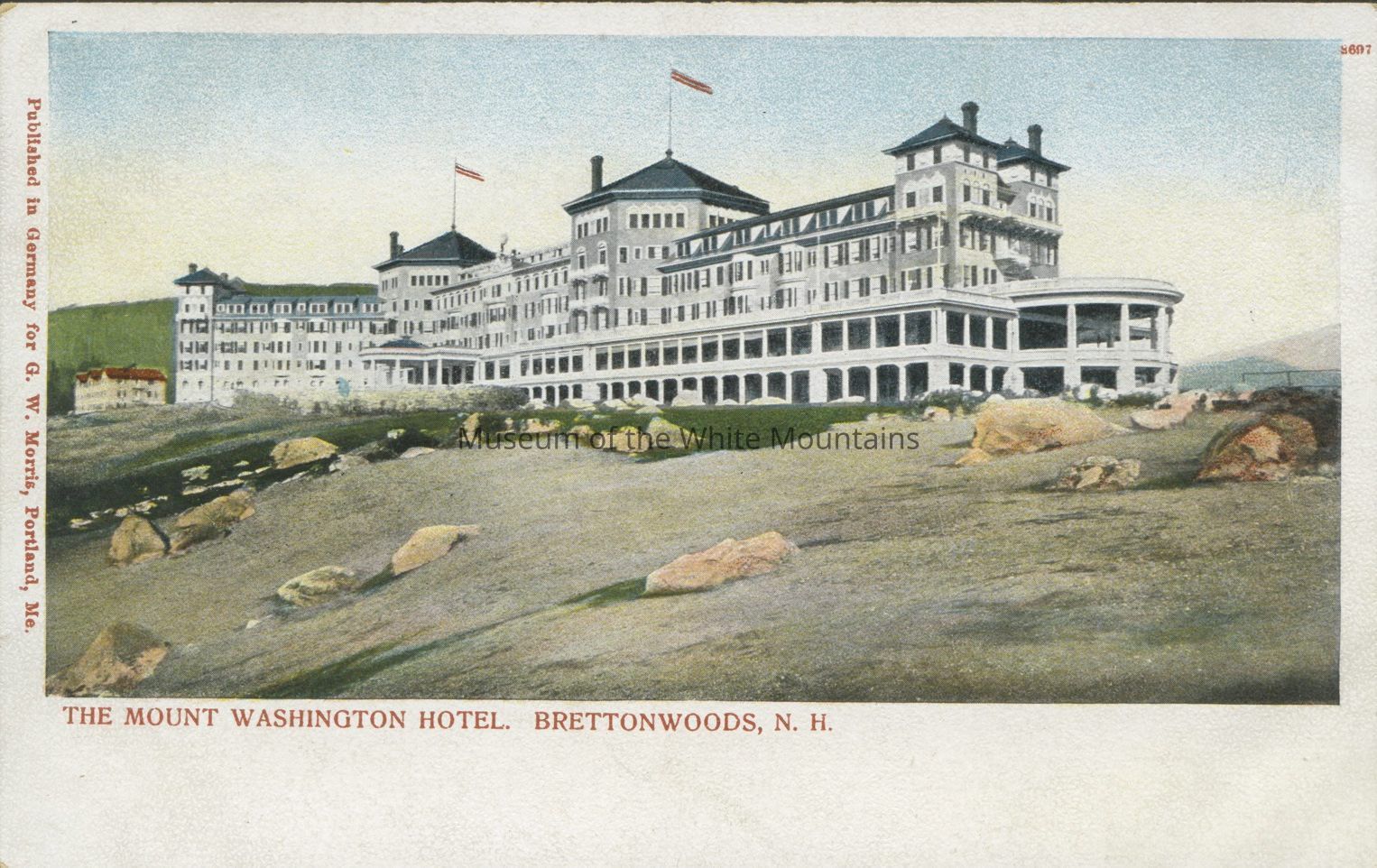 Colored image of a large hotel and a small side building. Caption reads, “The Mount Washington Hotel, Bretton Woods, N.H.”