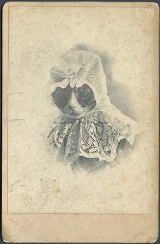 Black and white cabinet card. Studio portrait of a cat wearing a lace bonnet with a collar.