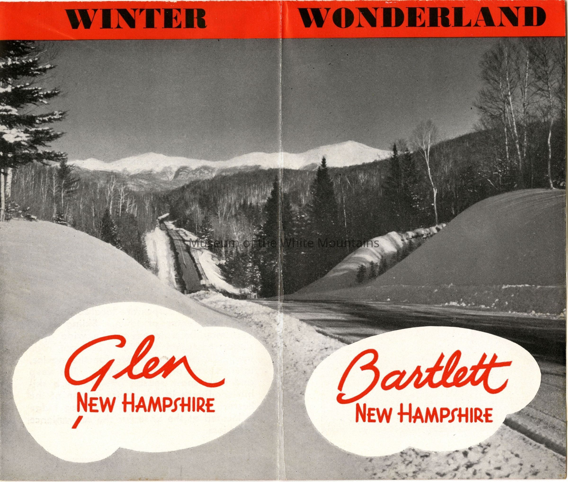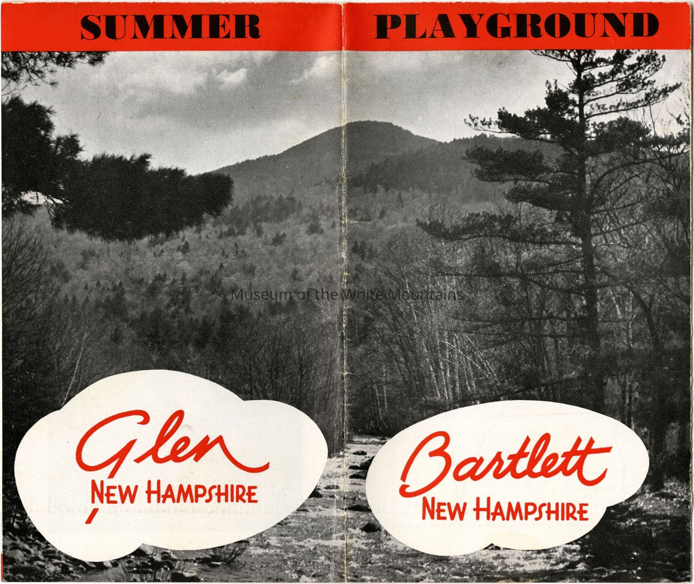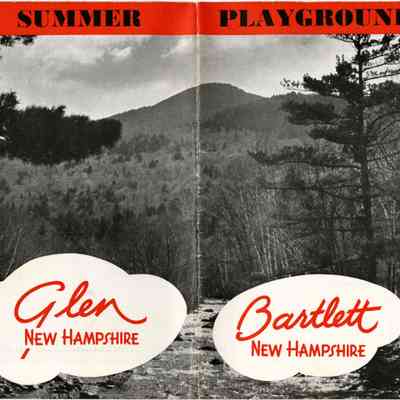 A small pamphlet in black and white with red accents containing images and text pertaining to summer and winter activities in Glen and Bartlett, New Hampshire.