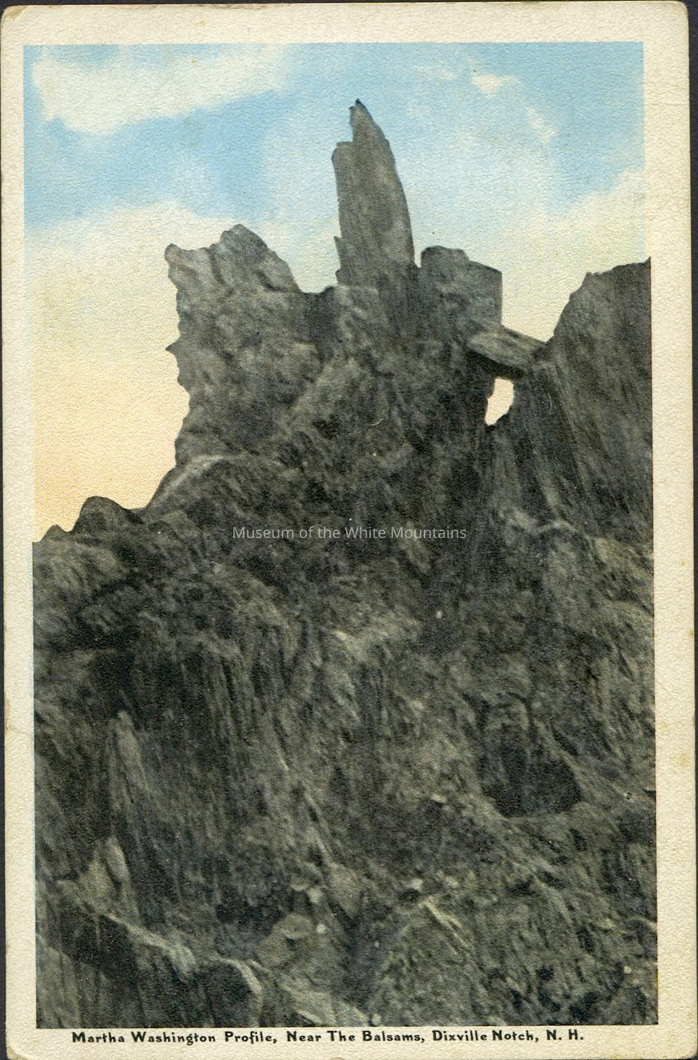 Colored image of a rock formation. Caption reads, "Martha Washington profile, near the Balsams, Dixville Notch, N.H.”