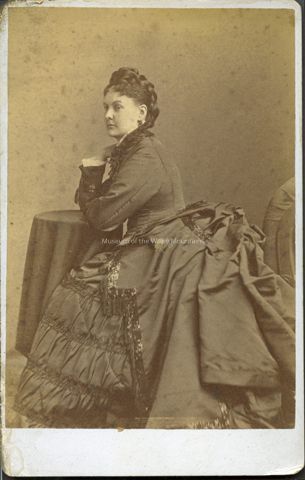 Black and white cabinet card. Full-body studio portrait of a young woman in a large, dark dress with her hair in an up-do. She is sitting and leaning against a small table.