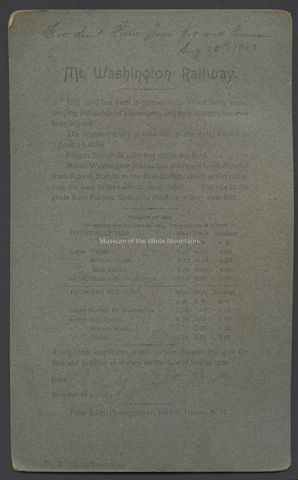 Washington, Mount (Coos county, New Hampshire : mountain), Boston and Maine Railroad, Bretton Woods (Coos county, New Hampshire : inhabited place), Fabyan House (Coos county, New Hampshire : inhabited place), Mount Washington Cog Railway, Mount Washington Base Station (Coos county, New Hampshire : inhabited place), Railroad passenger Automobiles