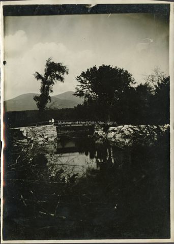 Image is a black and white view of a stone and wood bridge with two people on it. Under is a calm river. In the background are mountains and trees.