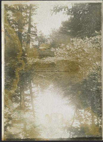 Image is a black and white view of a calm river with a wooden bridge spanning across. It is among leafy trees and plants.