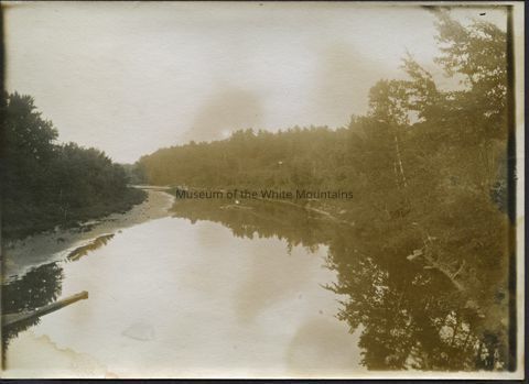 Image is a faded black and white view of a calm river with a sandy shoreline and trees lining it. The trees on the ride side are reflected in the river. Back Description: Blank