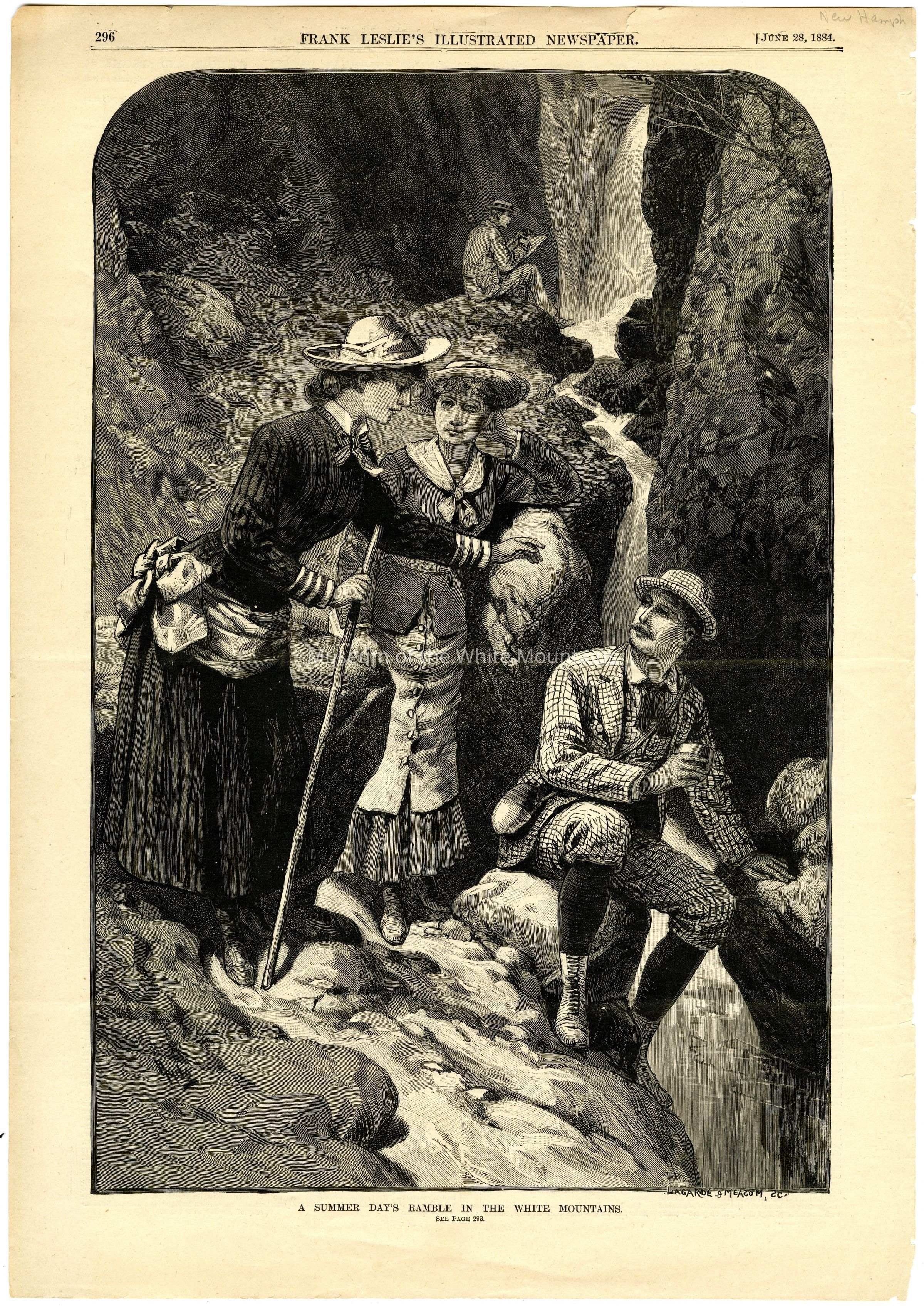 A page from Frank Leslie's Illustrated Newspaper dated June 28, 1884 containing on it's front a large engraving of some people near a waterfall captioned: 'A summer day's ramble in the White Mountains.'Type of Print