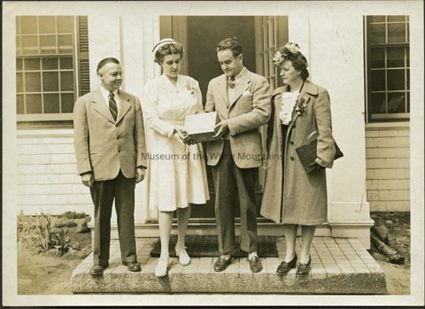 Black and white view of four people on the steps to a clapboarded home. One woman is dressed as a nurse. She and a man in a suit hold and look at a box. Another woman on the right in a long jacket and another man on the left in a suit look on.
