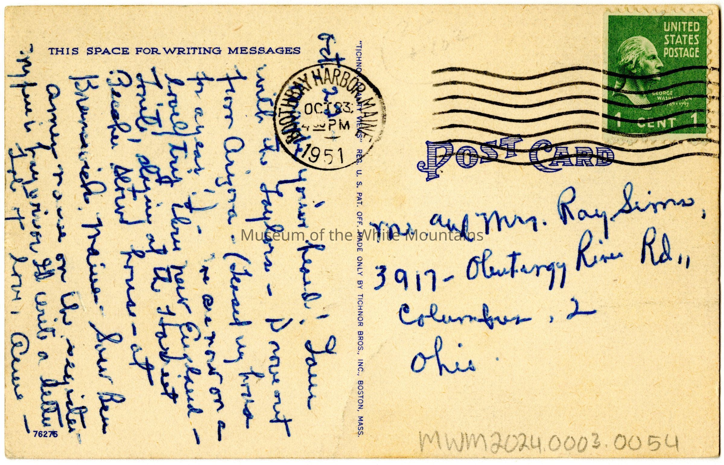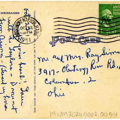 Divided postcard back. Postmarked from Boothbay Harbor, Maine on October 23, 1951 at 4pm.