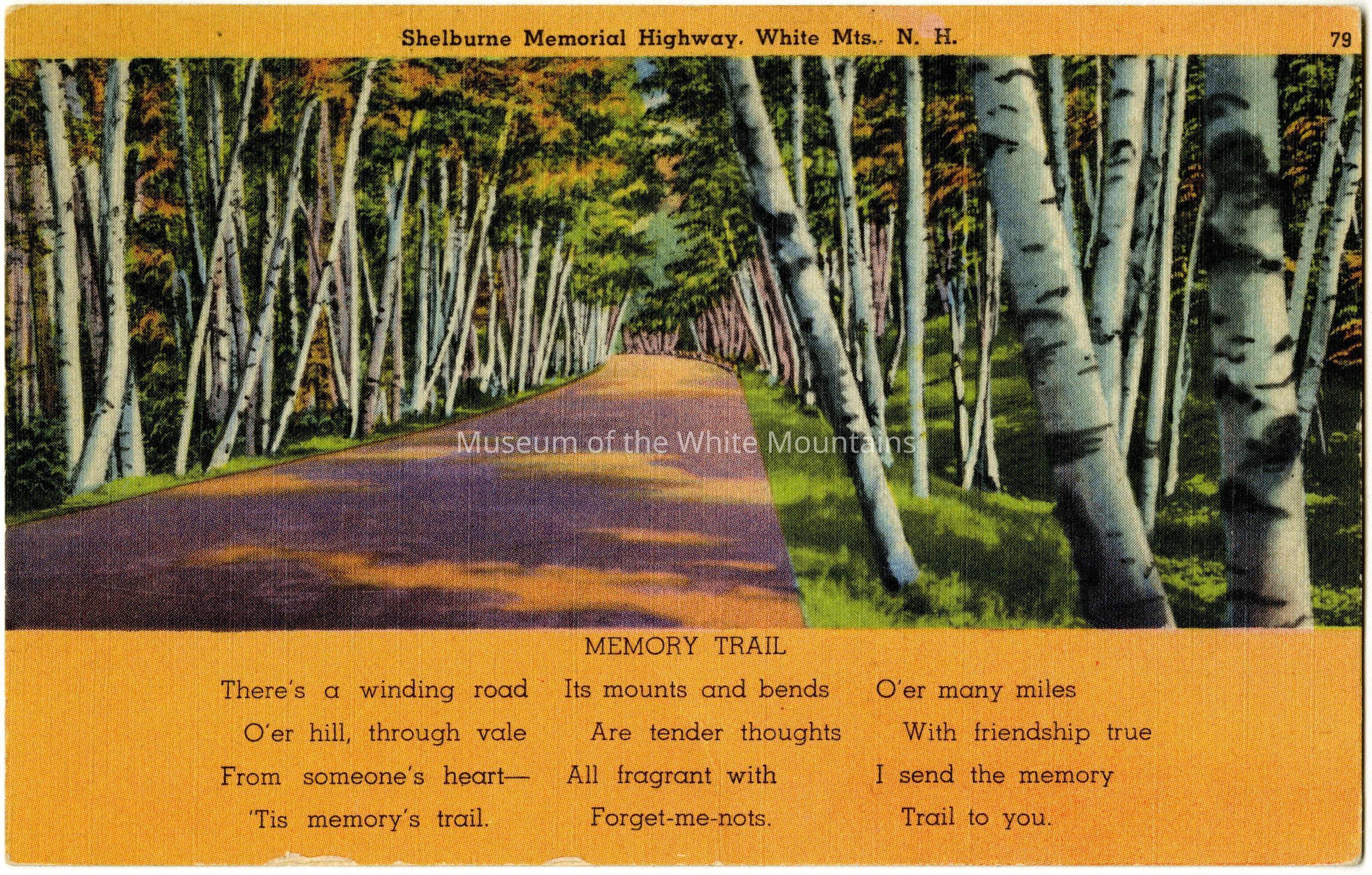 A postcard containing a landscape image of Shelburne Memorial Highway, White Mts., N. H, and a poem titled "Memory Trail:" There's a winding road / O'er hill, through vale / From someone's heart- / 'Tis memory's trail- // Its mounts and bends / Are tender thoughts / All fragrant with / Forget-me-nots. // O'er many miles / With friendship true / I send the memory / Trail to you.