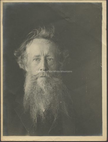 Black and white portrait of North Conway photographer, T.E.M. White. White is an older man with a long rough beard and messy hair. He wears a dark jacket. Back Description: Blank