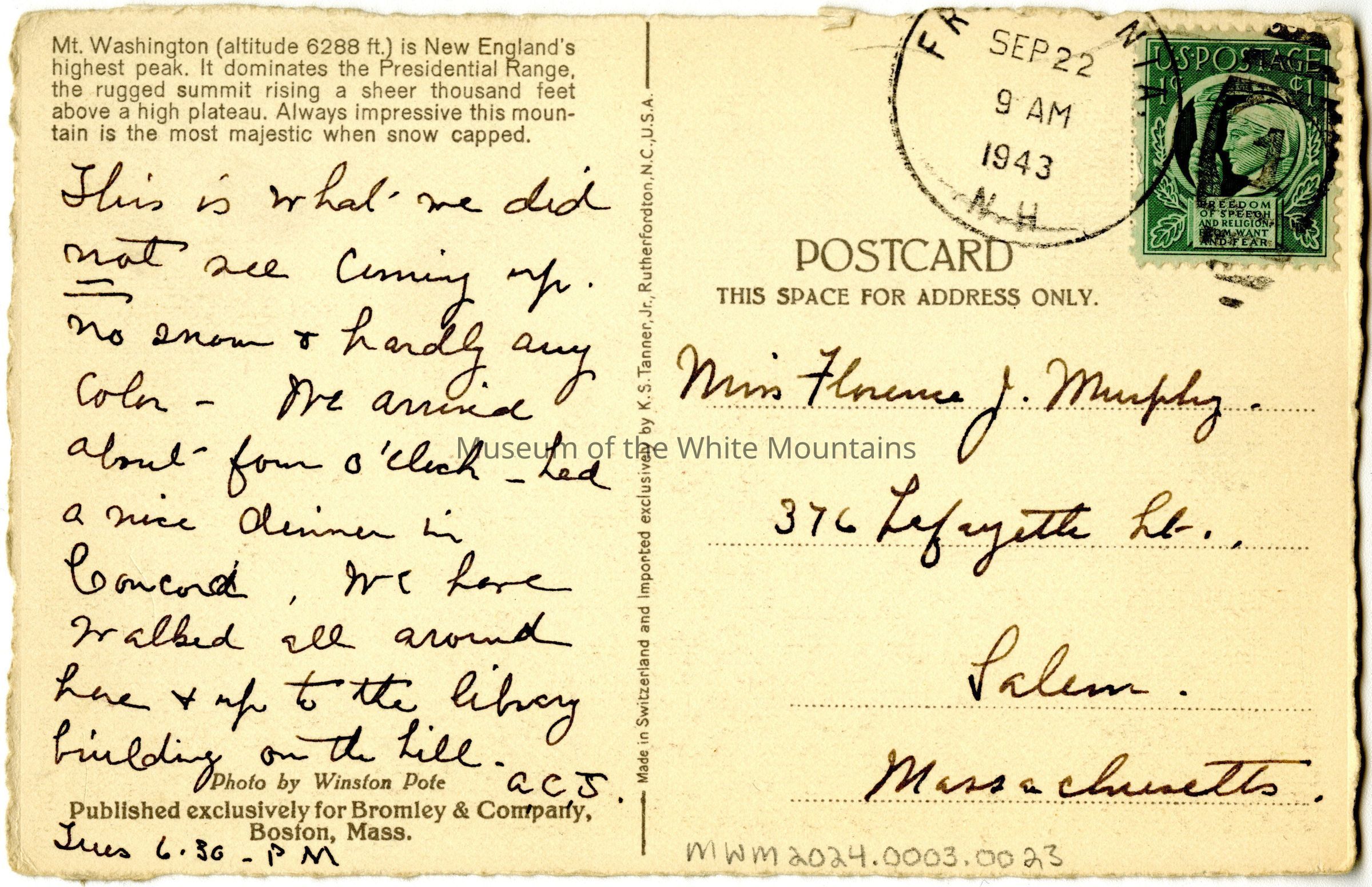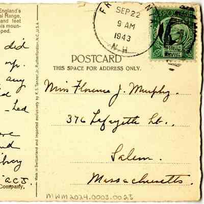 Postmarked in Franconia, NH on September 22, 1943 at 9am.