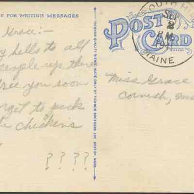 Back Description: Typical postcard back. Includes handwritten note, a postmark, and a postage stamp.