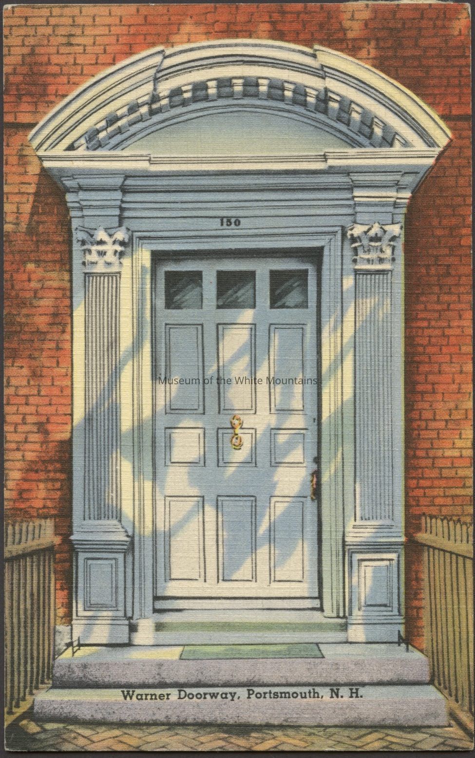 Colored image of a colonial door to a brick house. Caption reads, “Warner Doorway, Portsmouth, N.H.”