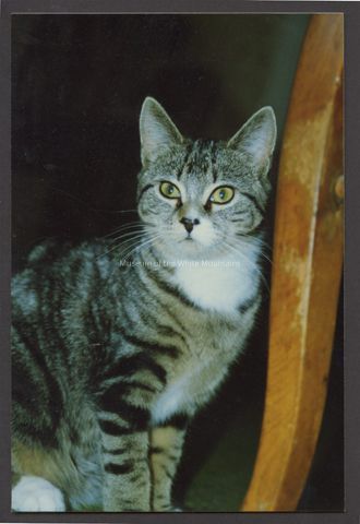 Image is of a cat with a black nose sitting by a wooden piece of furniture.