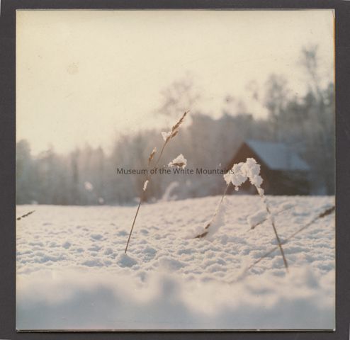 Image is a colored close-up of a snowy ground with a sprig of growth poking through the snow. In the background is a barn or shed and a row of trees.