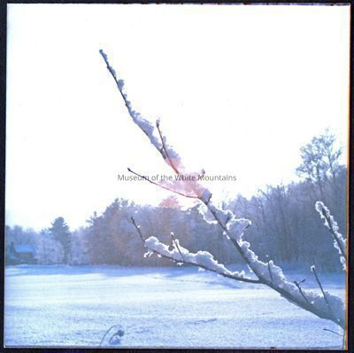 Image is a colored close-up of a snowy tree branch. In the background is a field covered in snow, a line of trees and a house. Back Description: Blank
