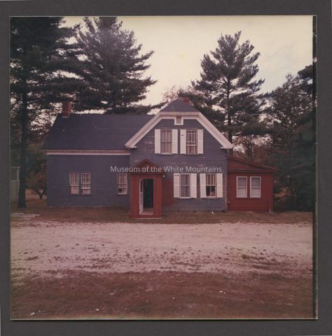 Image is a colored view of a small blue house with a gable end with a slight hipped roof, a side el, and side portico. It stands by a dirt road among trees.