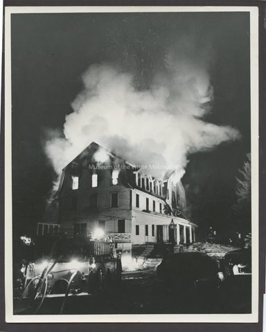 Image is a black and white view of a three-story gambrel roofed building burning at night. A firetruck and hose and automobiles are in the foreground. There is snow on the ground. Fire fighters are close to and on the house with hoses. A large cloud of smoke is released fro mthe upper stories of the house. Related Search Terms: North Conway Fire Department Back Description: Blank