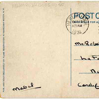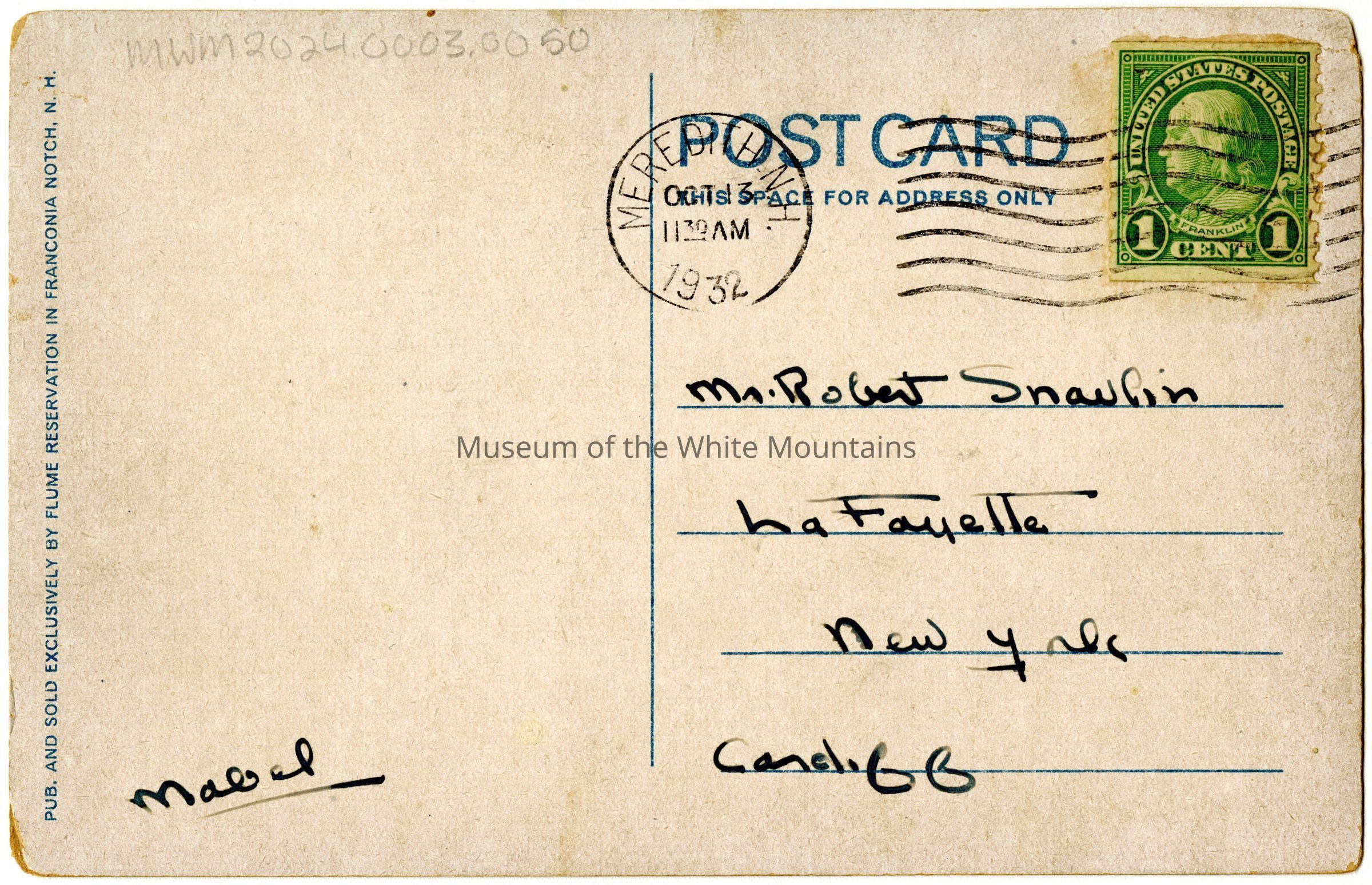 Divided postcard back. Postmarked from Meredith NH, on October 3, 1932 at 11:30am.