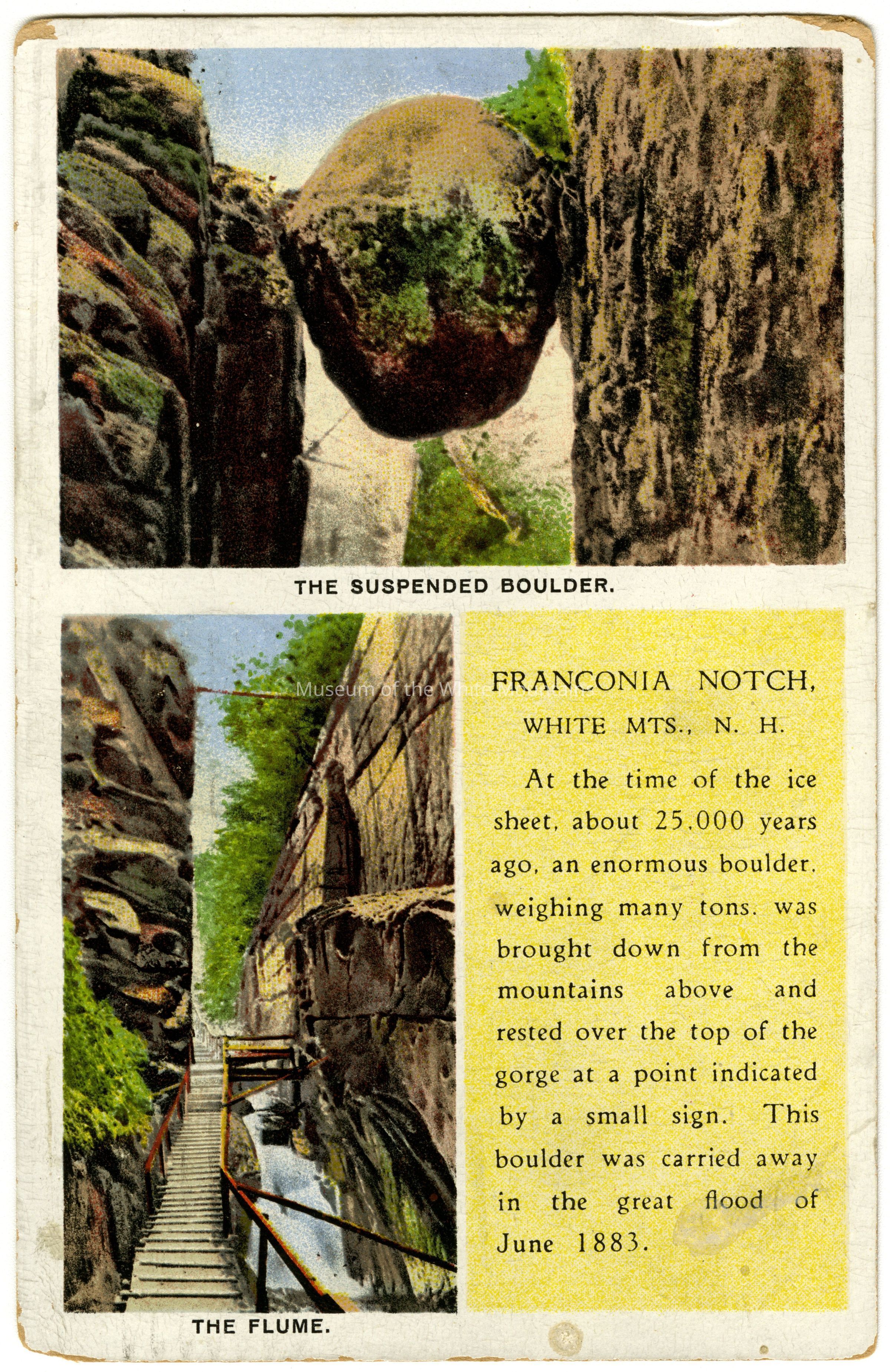 A postcard containing one landscape image of 'The Suspended Boulder,' one portrait image of 'The Flume,' and a small description of the story of the boulder: "FRANCONIA NOTCH, WHITE MTS., N. H. At the time of the ice sheet, an enormous boulder, weighing many tons, was brought down from the mountains above and rested over the top of the gorge at a point indicated by a small sign. This boulder was carried away in the great flood of June 1883.