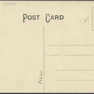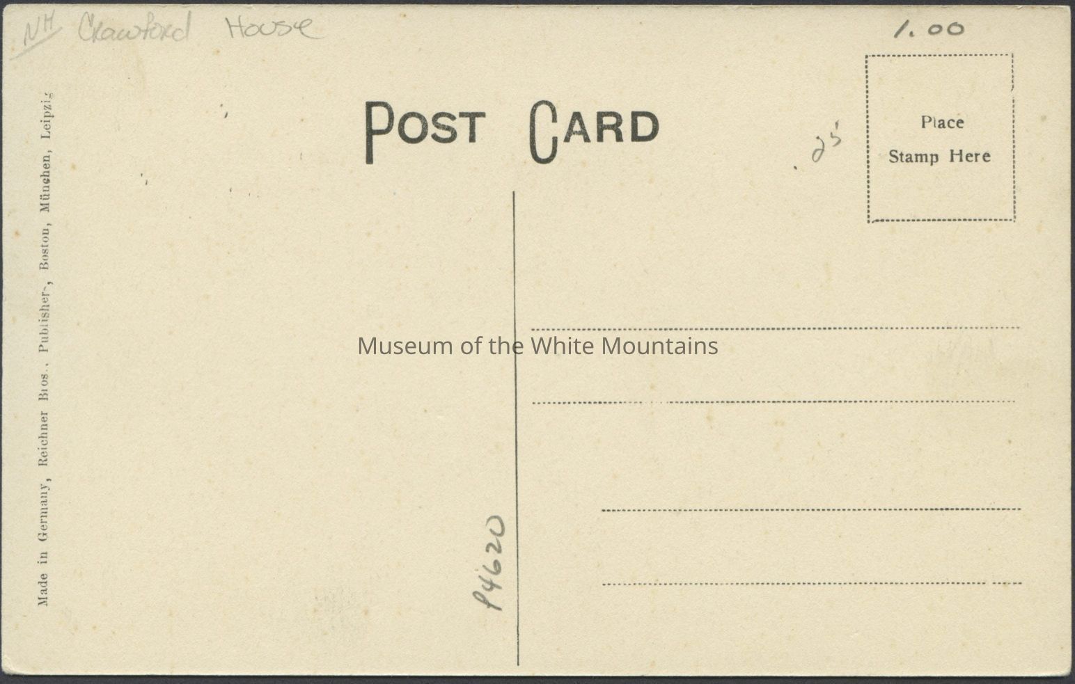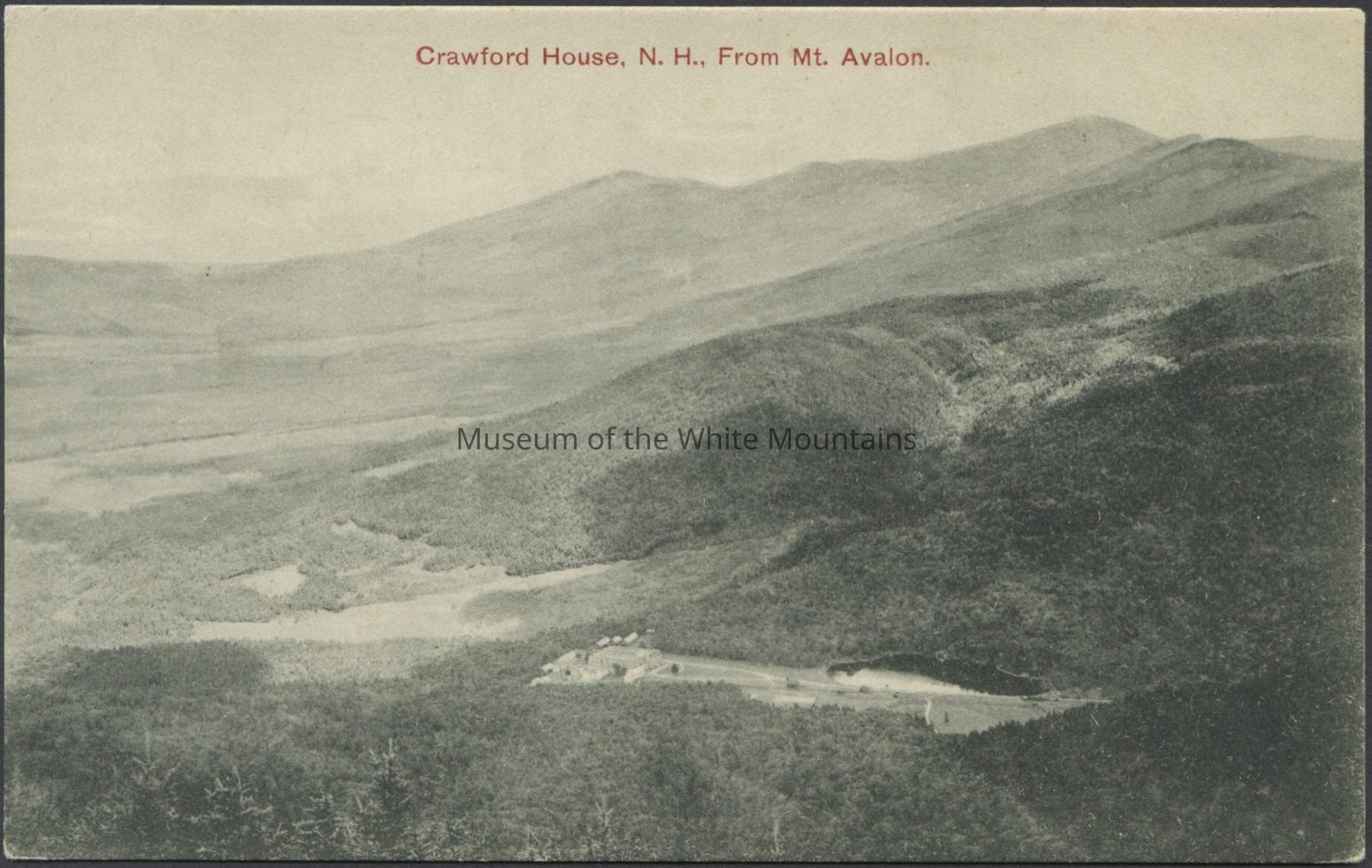 Black and white image with a view of mountains and valleys and a clearing in which is a large hotel. Caption reads, “Crawford House, N.H., from Mt. Avalon.” Back Description: Typical postcard back.