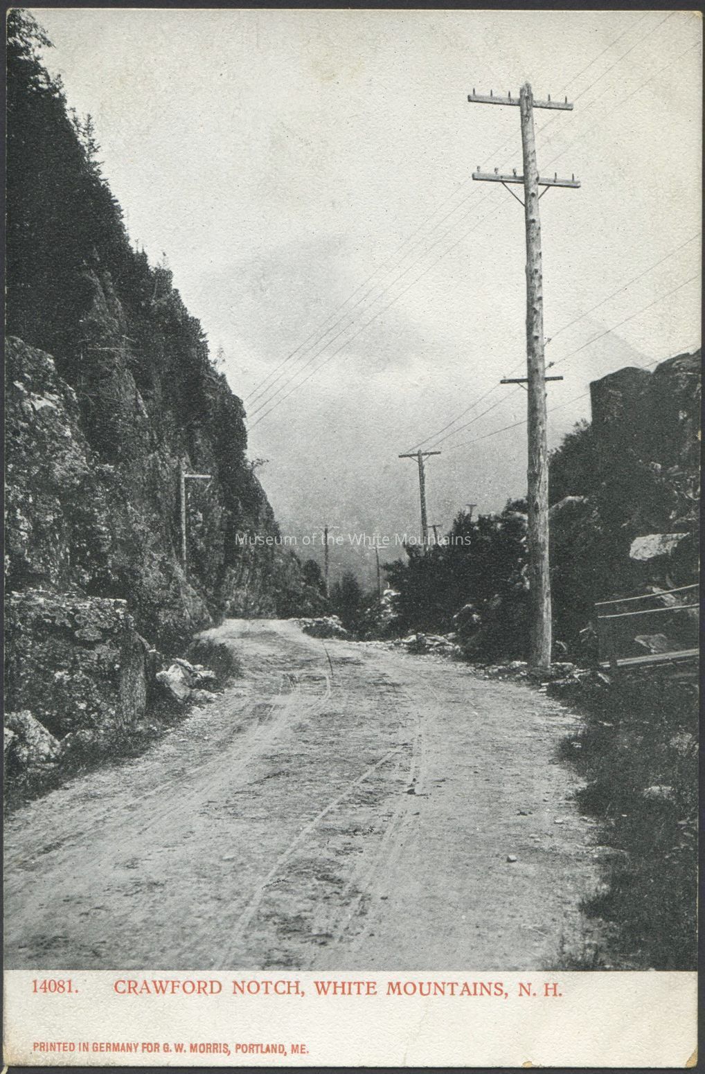 Black and white image of a road lined with utility poles and rocks with mountains in the cloudy distance. Caption reads, “Crawford Notch, White Mountains, N.H.”