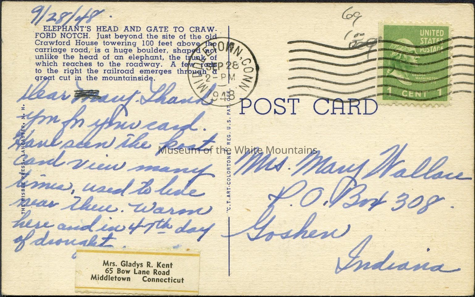 Transcription: "9-28-48 Dear Mary, Shand you… card. Have seen the post card view many times, Used to live near there. Warm here and in 47th day of drought. Mrs. Gladys R. Kent
