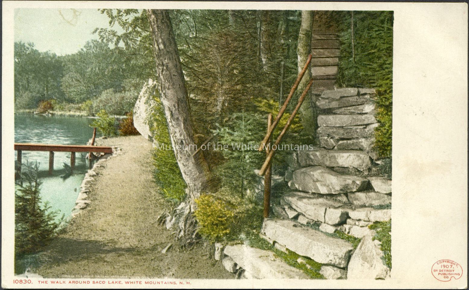 Colored image of a path and rock steps by the edge of a forest. Also in view is a lake with a footbridge. Caption reads, “The Walk around Saco Lake, White Mountains, N.H.”