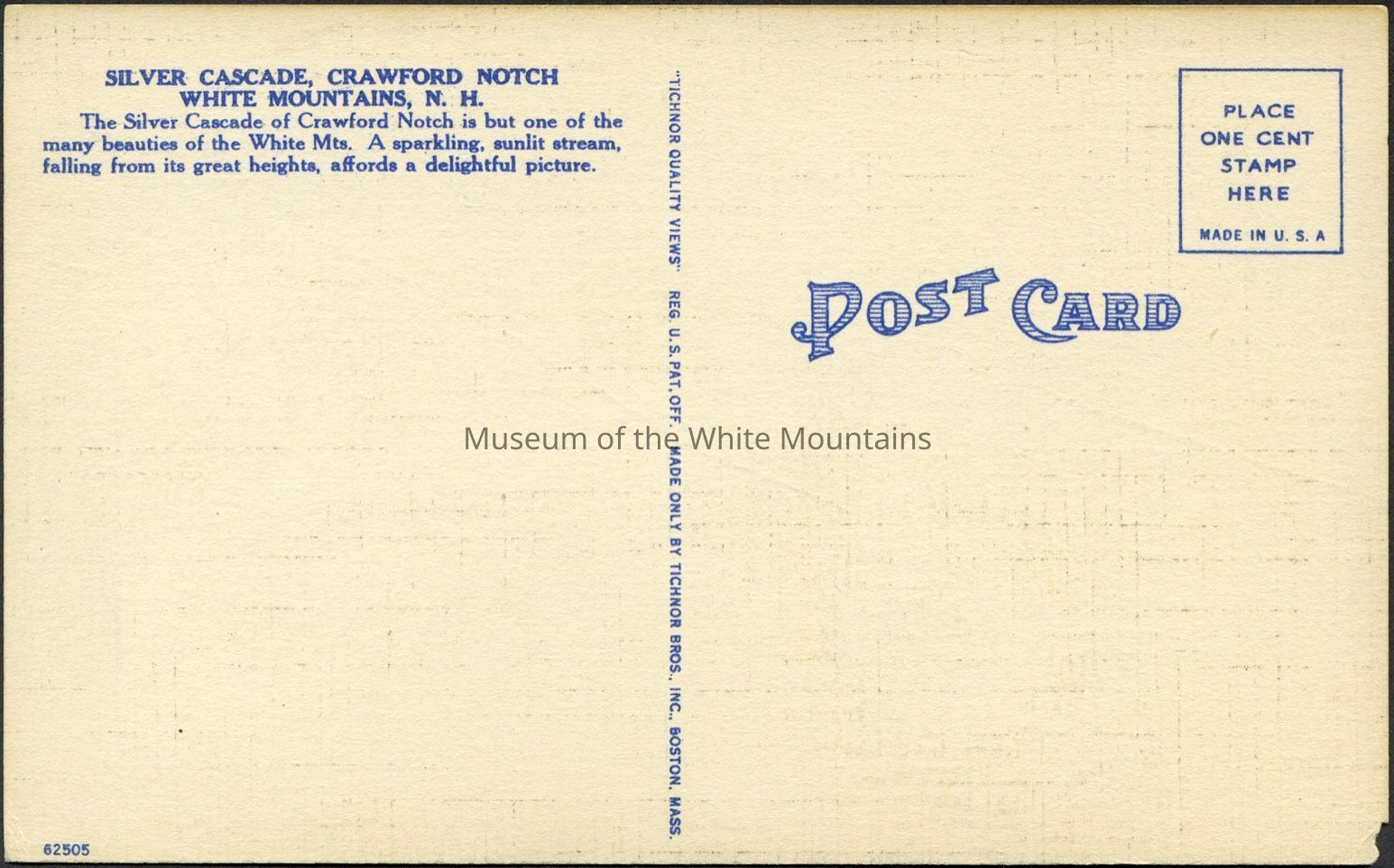 Colored image of a waterfall over a rocky ledge. Caption reads, “Silver Cascade, Crawford Notch, White Mountains, N.H.”
