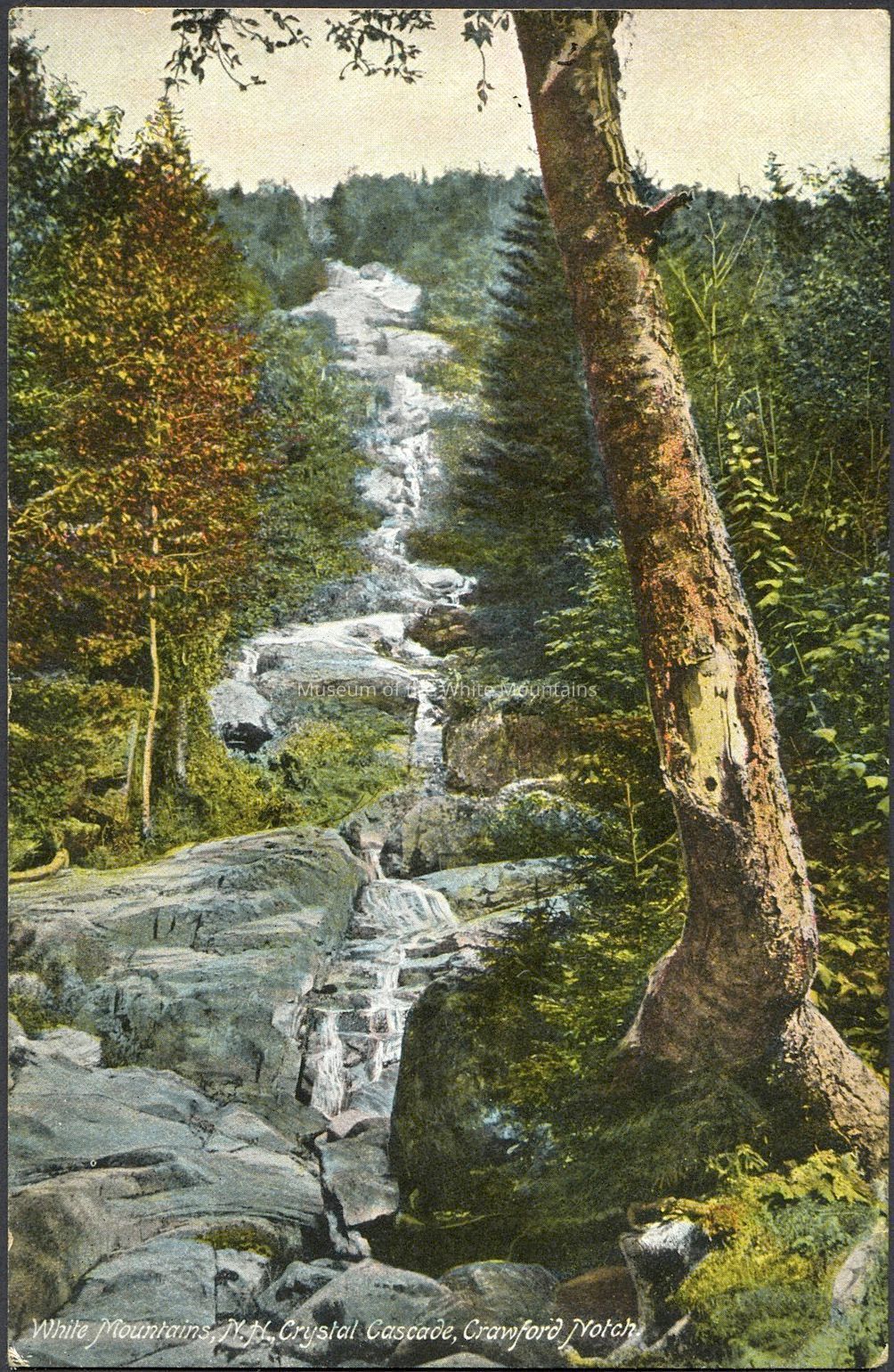 Colored image of a waterfall over a rocky ledge with trees. Caption reads, “White Mountains, N.H. Crystal Cascade, Crawford Notch.”