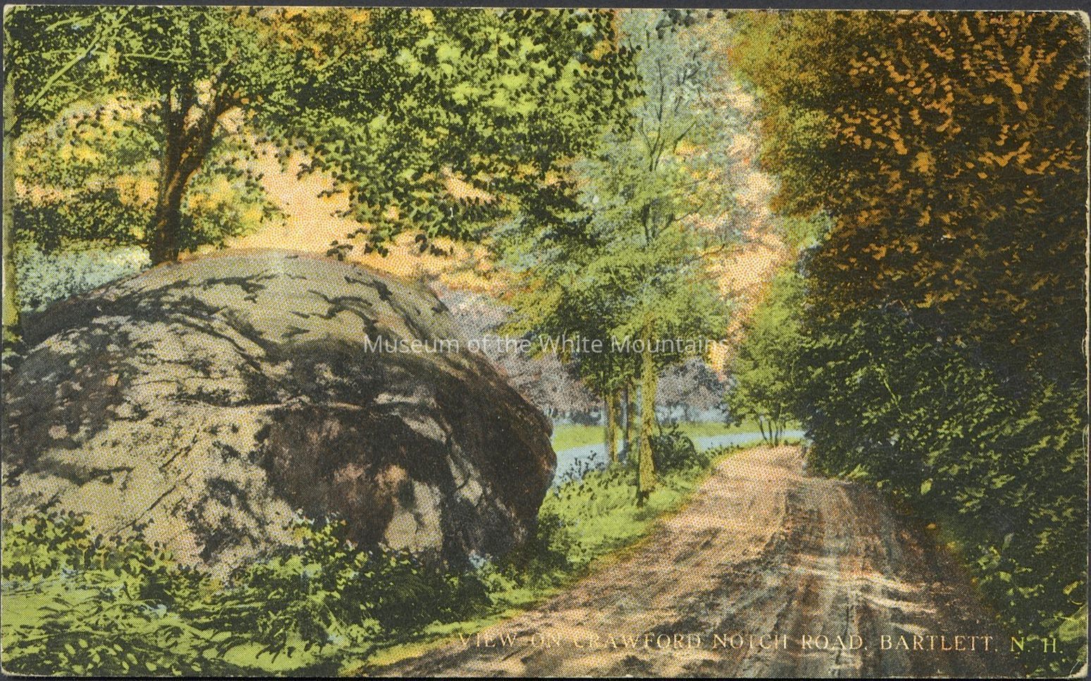 Colored image of a dirt road with trees and a large rock by it. Caption reads, “View on Crawford Notch Road, Bartlett, N.H.”