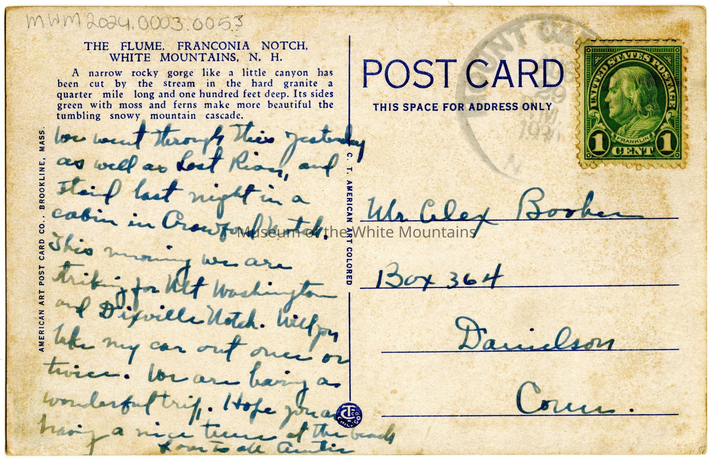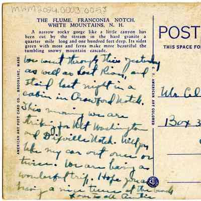 Divided postcard back. Postmarked from Mount [Oat-? Car-?] New Hampshire on August 29, 1930 in the afternoon. Back contains further information on the subject of the postcard's image: THE FLUME, FRANCONIA NOTCH, WHITE MOUNTAINS, N. H. / A narrow rocky gorge like a little canyon has been cut by the stream in the hard granite a quarter mile long and one hundred feet deep. Its sides green with moss and ferns make more beautiful the tumbling snowy mountain cascade.