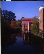 View of a mill building beside a mill pond in Whitefield, NH. The building in the foreground is made of bricks, while the buildings behind it are painted a bright red. The river is lined with a stone wall and trees. In the distance on the river bank there are several trees with brightly colored red leaves. There are small rapids at the bottom of the mill.Collection