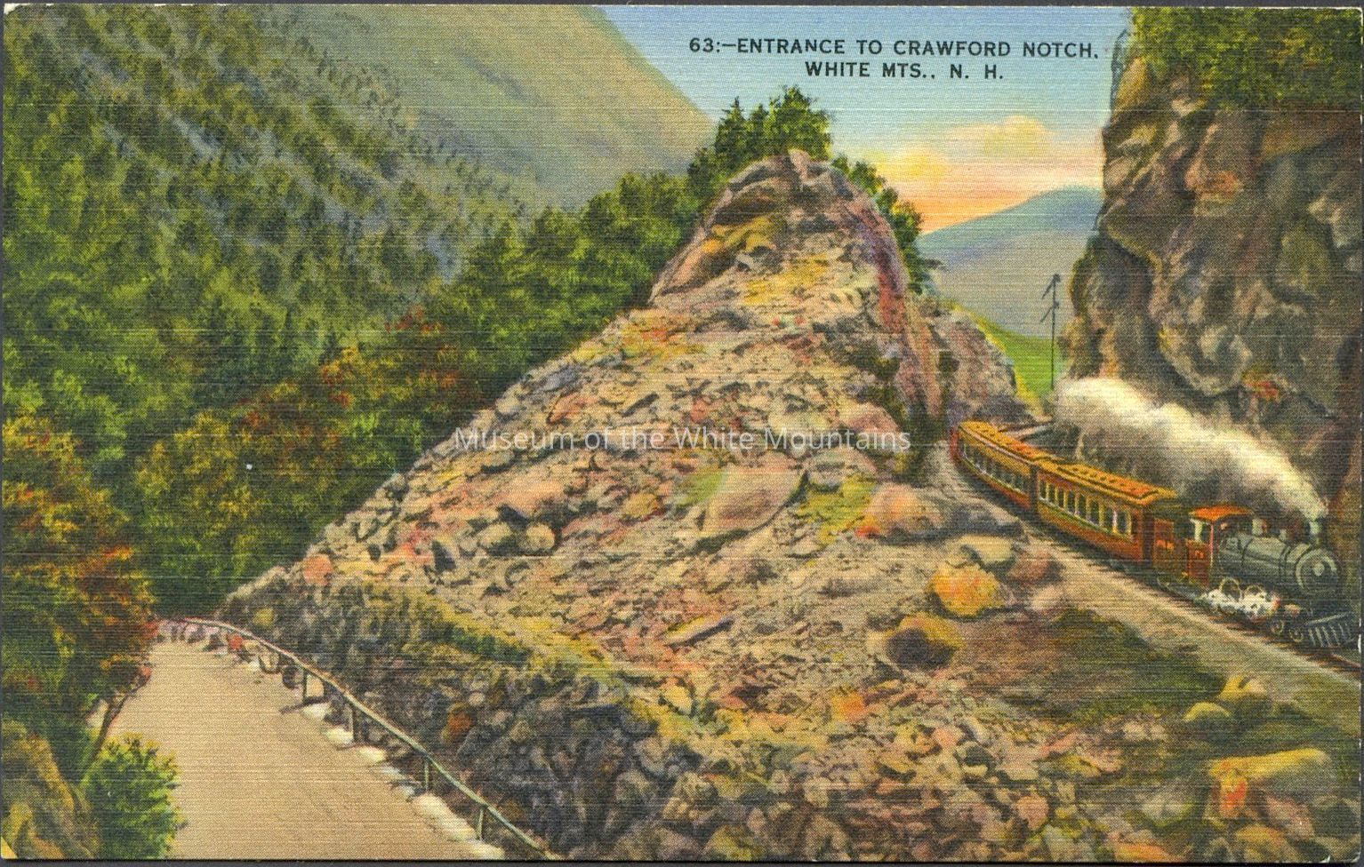 Colored image of a dirt road and railroad tracks, almost parallel, with mountains in the background. A train is in the view. Caption reads, “Entrance to Crawford Notch, White Mts., N.H.”