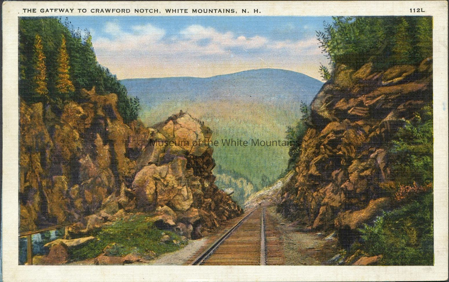 Colored image of a set of railroad tracks among the mountains. Caption reads, “The Gateway to Crawford Notch, White Mountains, N.H.”