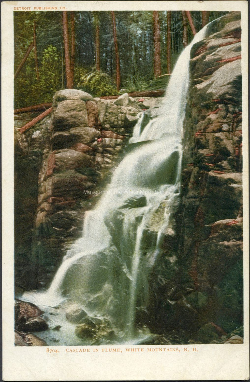 Colored image of a waterfall over a rocky ledge with trees. Caption reads, “Cascade in Flume, White Mountains, N.H.”