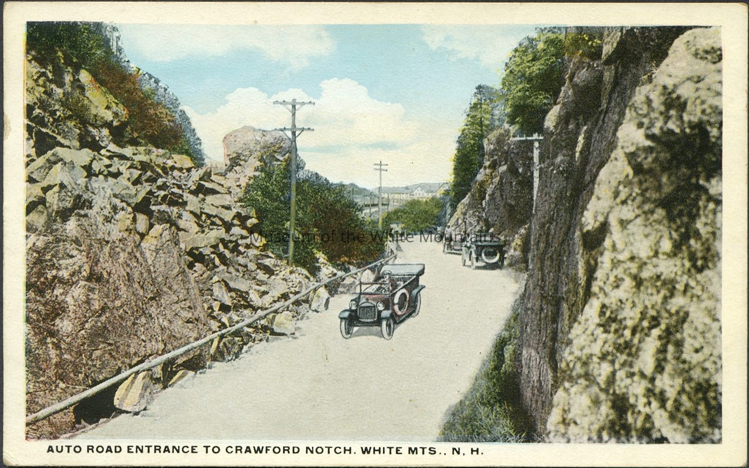 Colored image of a dirt road among the mountains with several automobiles on it. In the distance is a hotel and more mountains. Caption reads, “Auto road entrance to Crawford Notch, White Mts, N.H.”