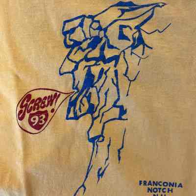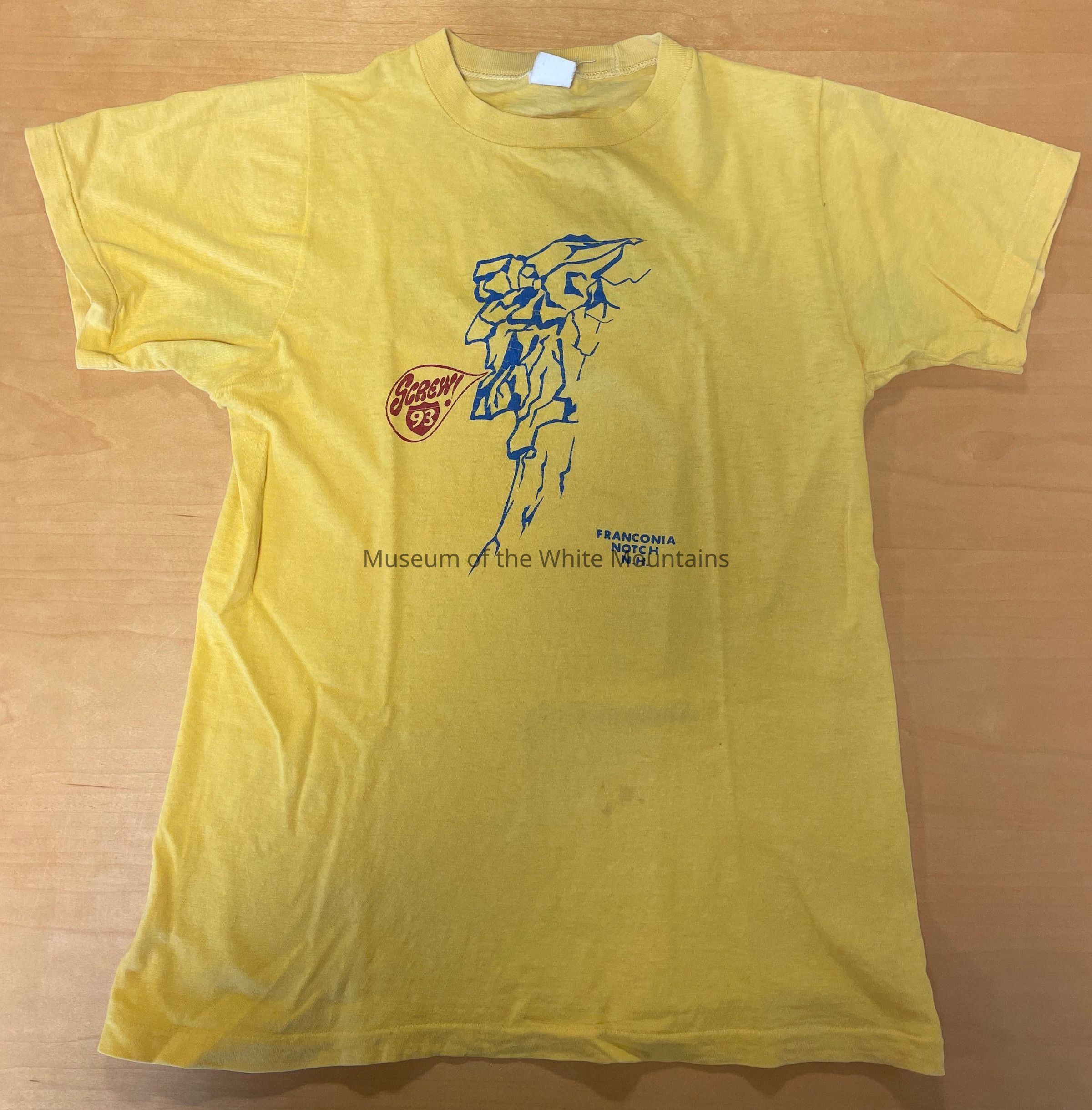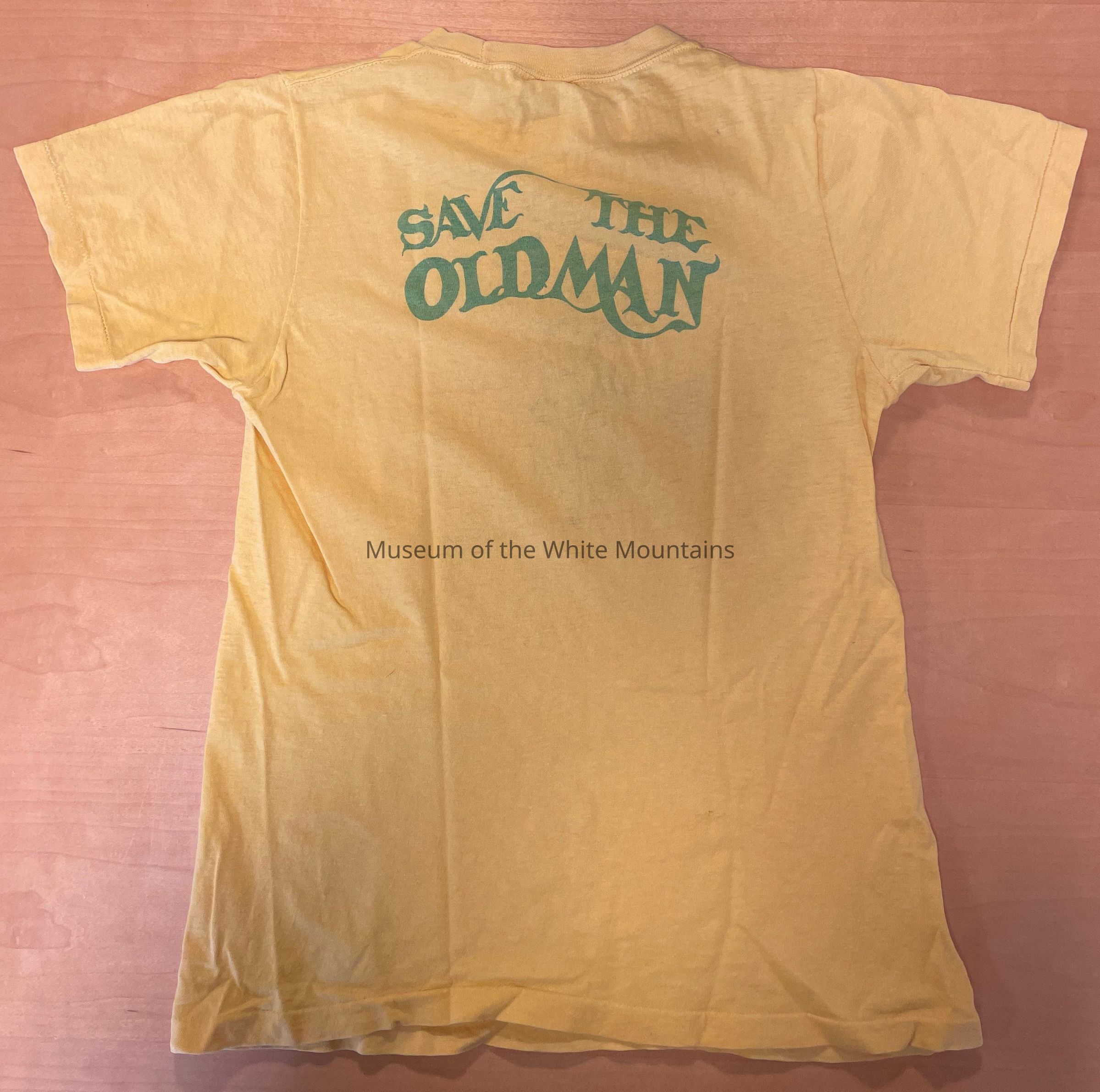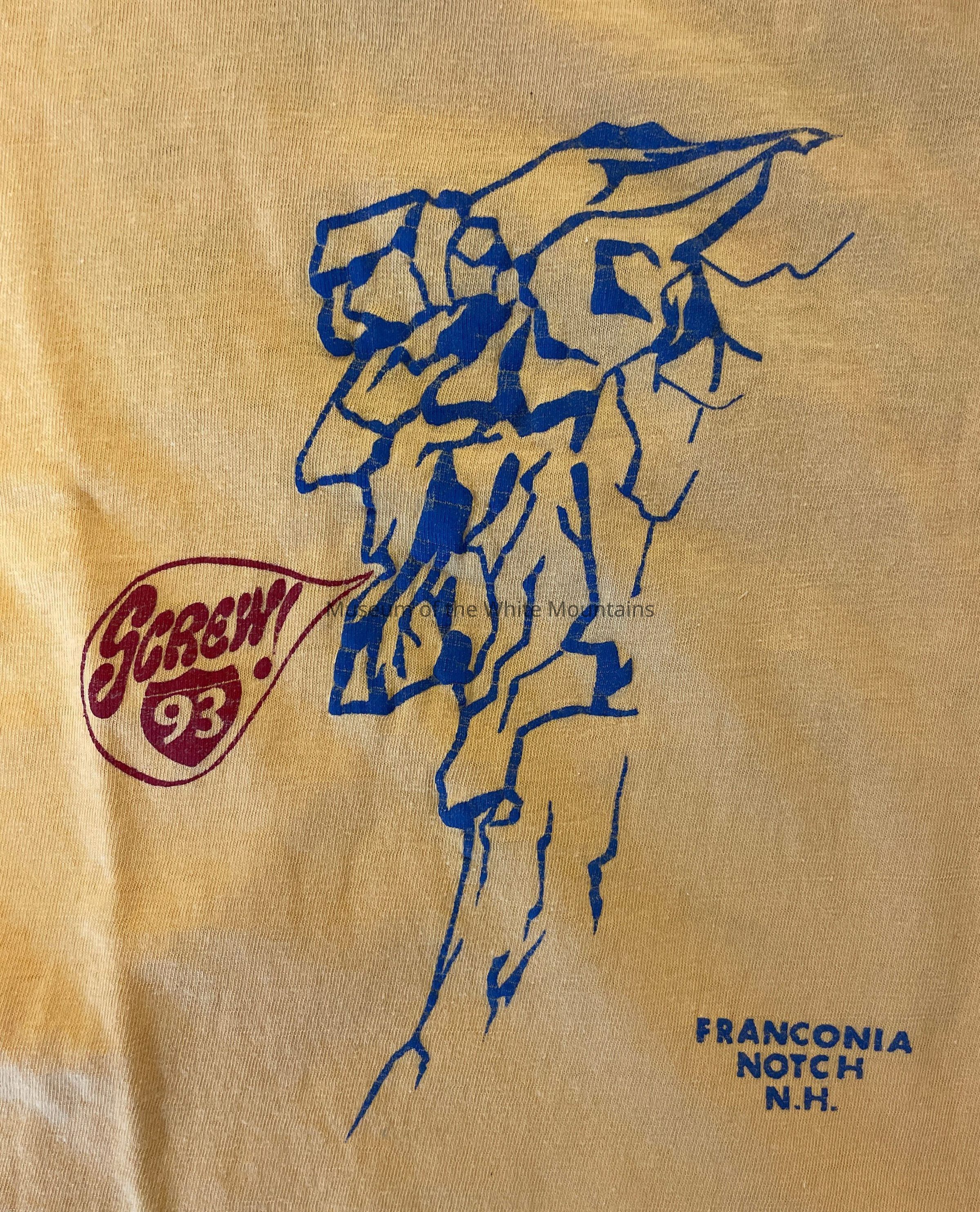 This is a cotton t-shirt depicting the Old Man of the Mountain in opposition to the construction of Interstate-93 through Franconia Notch in New Hampshire. The shirt is a bright yellow color, with the profile of the Old Man outlined in blue, with the lettering "Screw 93!" written in red. The back of the shirt reads, "Save the Old Man" written in green.Context