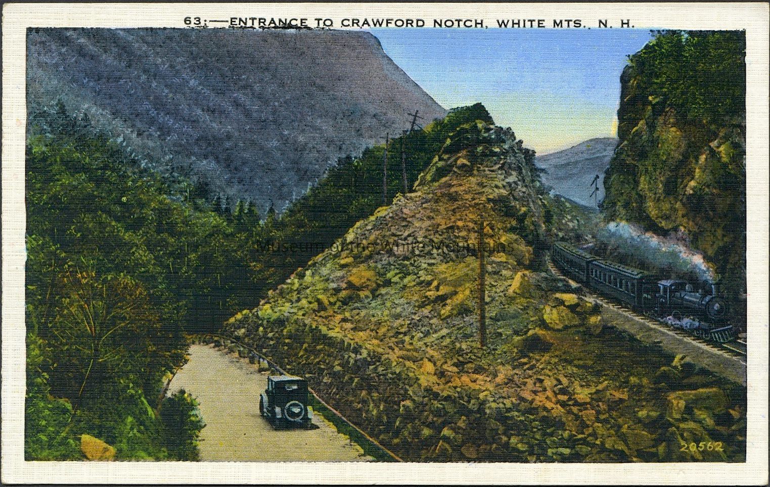 Colored image of a dirt road and railroad tracks, almost parallel, with mountains in the background. A train and automobile are in the view. Caption reads, “Entrance to Crawford Notch, White Mts., N.H.”