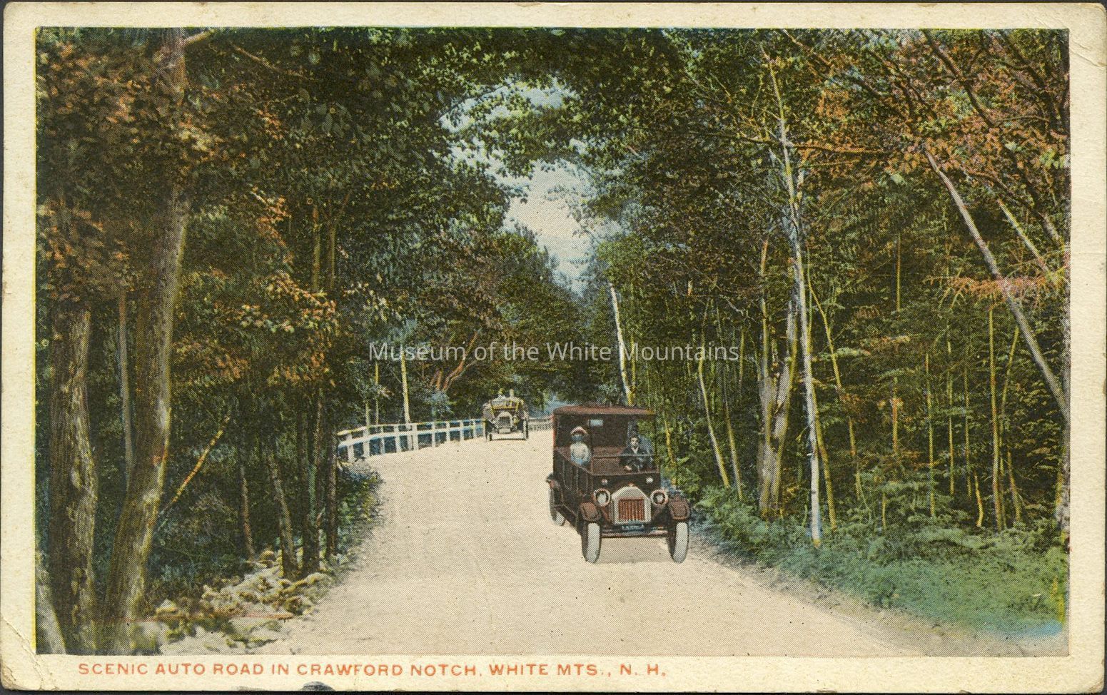 Colored image of a dirt road among the trees with two automobiles on it. Caption reads, “Scenic auto road in Crawford Notch, White Mts., N.H.”