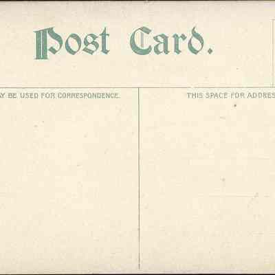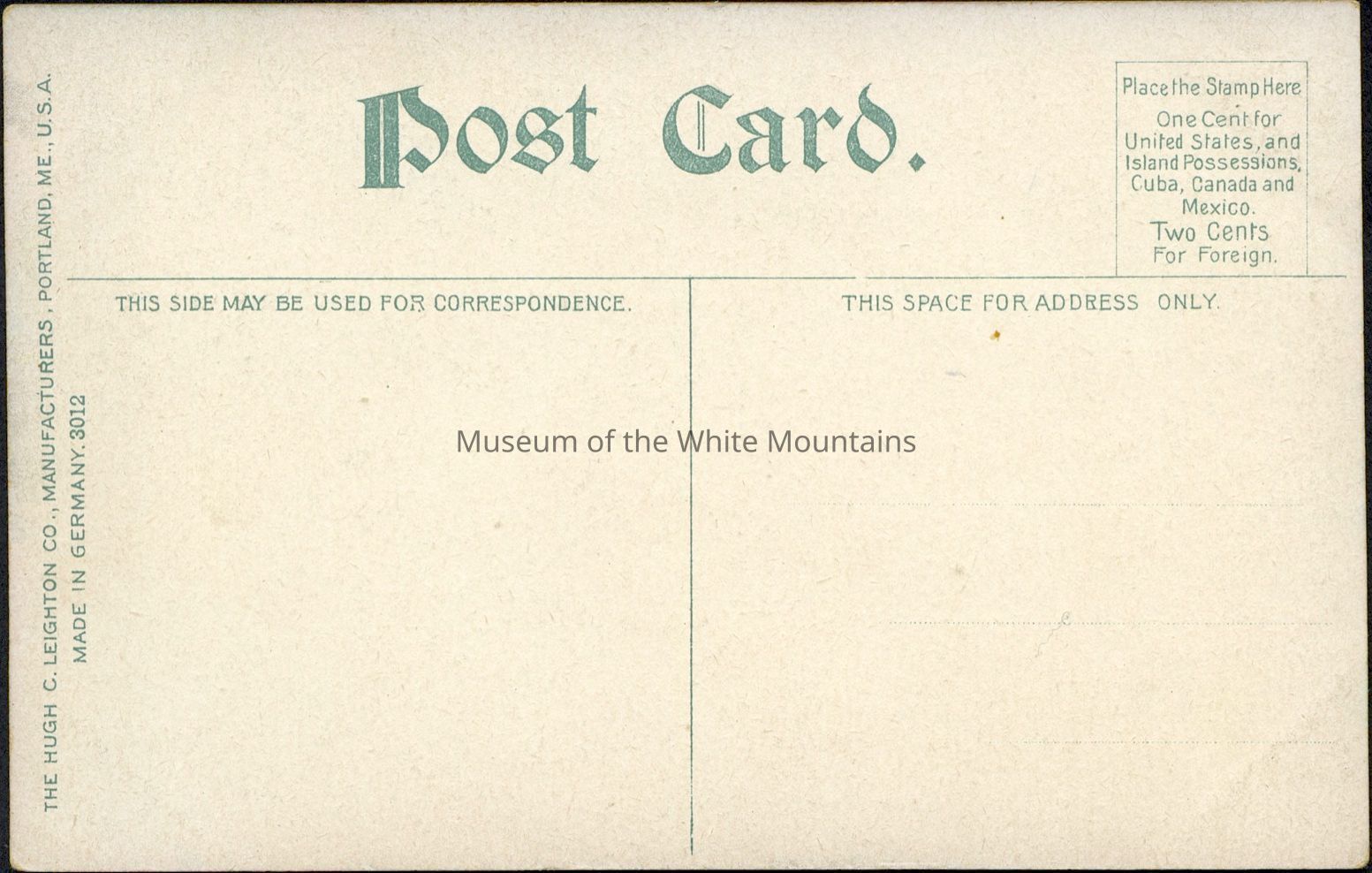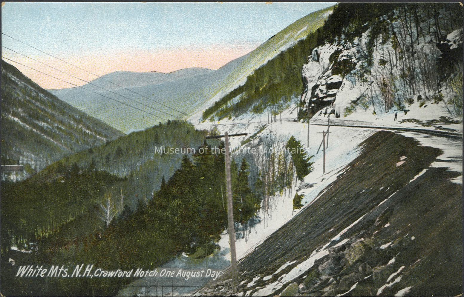 Colored image of mountains with snow on them. In view is a person, and utility poles. Caption reads, “White Mts., N.H. Crawford Notch One August Day.”