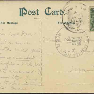 Back Description: Typical postcard back. Features a handwritten note, postmark, and postage stamp.