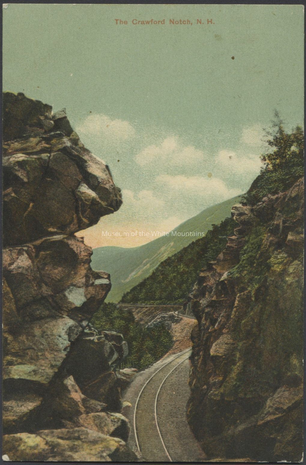 Colored image of a set of railroad tracks among the mountains. Caption reads, “The Crawford Notch, N.H.”