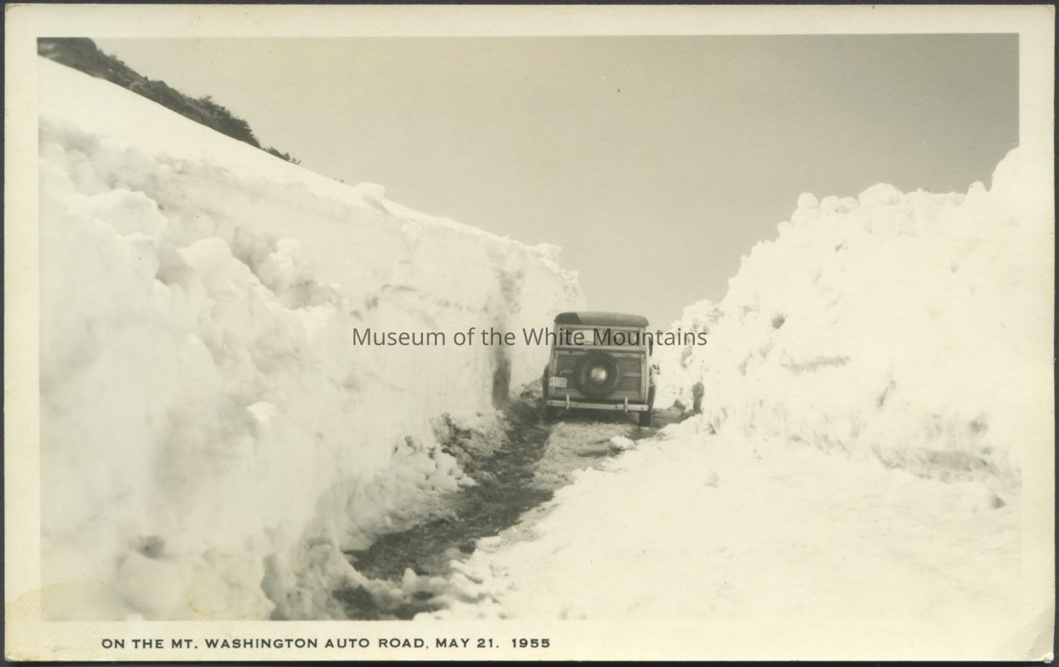 Black and white image of an automobile driving through a path carved out of snow. Caption reads, “On the Mt. Washington Auto Road, May 21, 1955.”