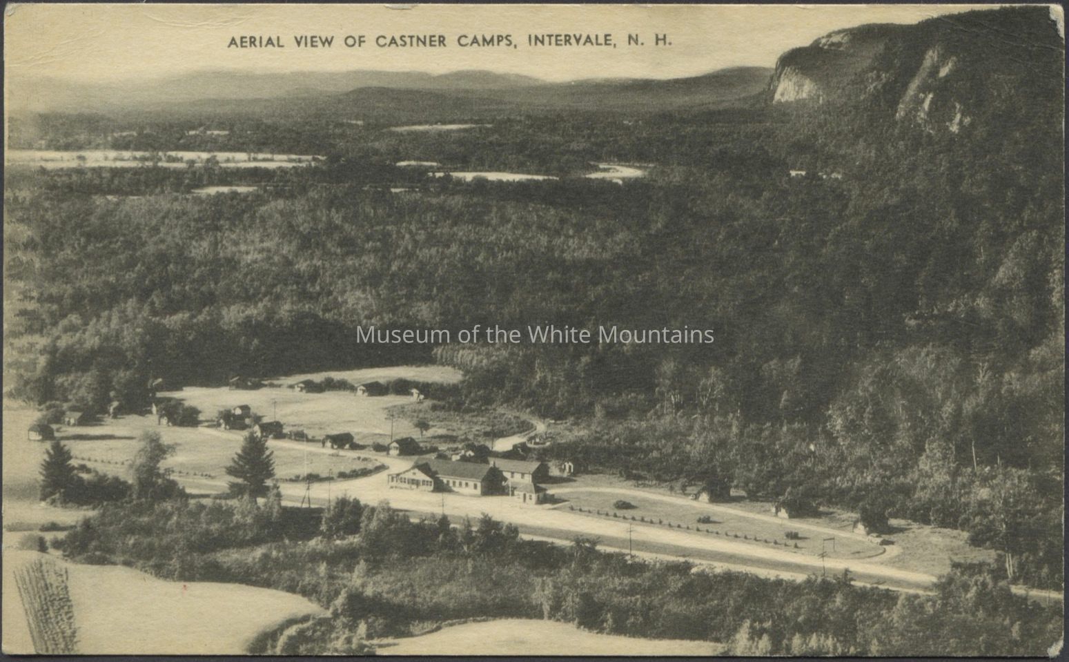 Sepia toned image of several camp cottages, a parking lot, automobiles, and mountains in the distance. Caption reads, “Aerial View of Castner Camps, Intervale, N.H.”