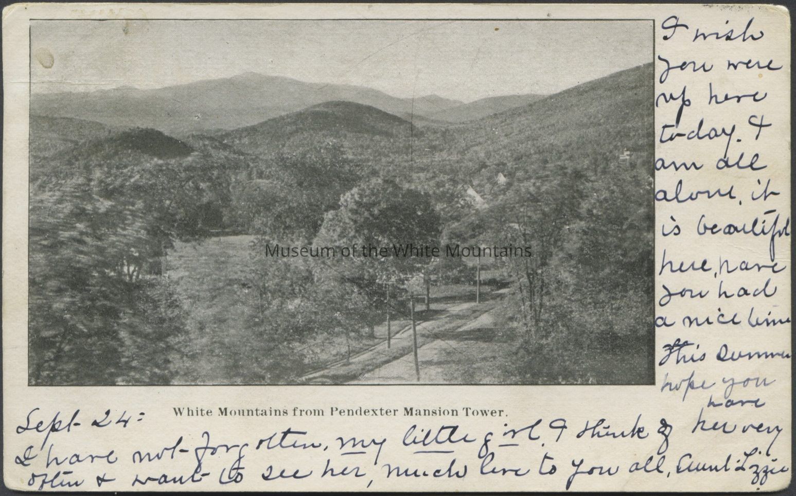 Black and white image of trees, a trail, and mountains. Caption reads, “White Mountains from Pendexter Mansion Tower.”