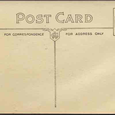 Sepia toned image of a road lined with utility poles and trees. A house is partially in view, from which an American flag hangs. Caption reads, “Pendexter Mansion, Intervale, N.H.”
