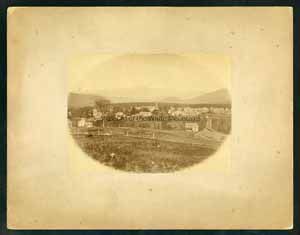 This is a photograph of North Conway, NH. There are many houses, railroad tracks on the right, and fences and fields in the front. There is a child's head in the bottom left of the photo. Written on the back in pen, "Property of Louis H. Pray" "Loaned to North Conway Public Library"Collection