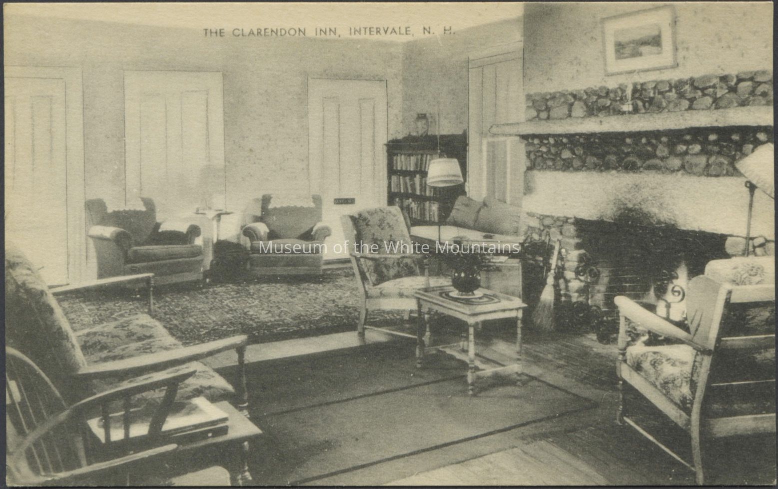 Black and white image of an interior. It features a stone fireplace, several chairs, a bookshelf, and coffee table. Caption reads, The Clarendon Inn, Intervale, N.H.”