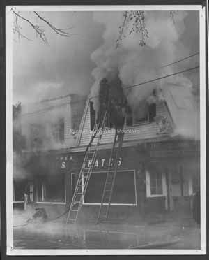 Shutters, Men, Sidewalks, Trees, People, Fire fighters, Fires, Smoke, Hoses, Ladders, WindowsSearch Terms